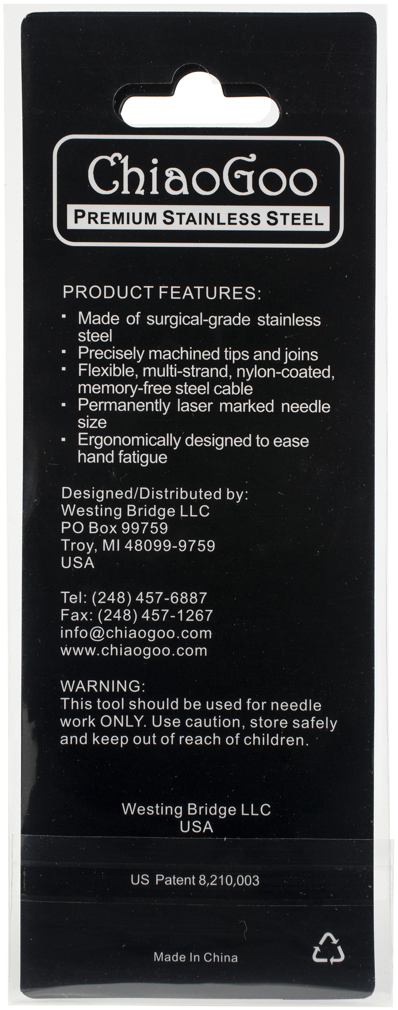 These stainless steel circulars have a smooth, satin-sheen finish and memory-free, multi-strand, steel cable coated with red nylon allowing yarn to slide right over. This package contains one pair of size 1/2.25mm circular knitting needles with a 9 inch cord. Imported.